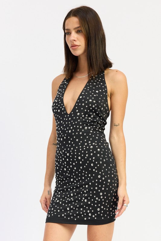 Sleek and modern, the Marisol Metallic Hotfix Halter Mini Dress features a halter neckline and all-over metallic hotfix detailing for subtle shimmer and dimension. The mini length creates a contemporary silhouette, while the lined interior ensures comfort and ease of movement. This dress is ideal for evening events, cocktail parties, or special occasions where effortless style is essential.
