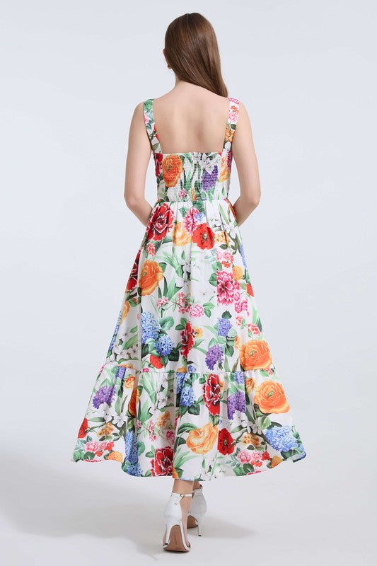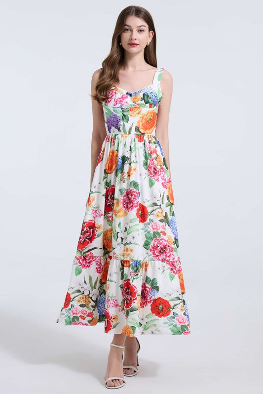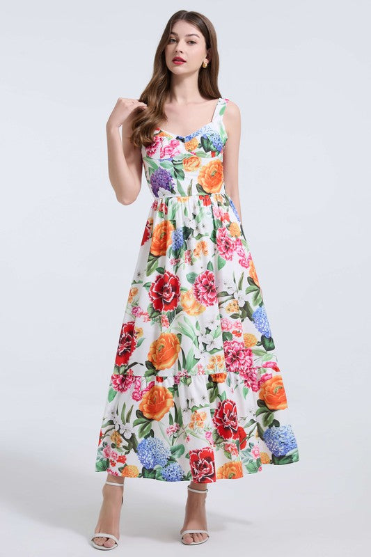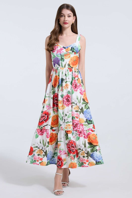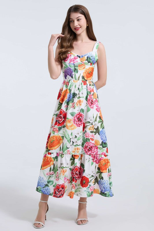 The Genevieve Floral Bustier Maxi Dress is a charming and feminine piece perfect for warm weather occasions. This white floral maxi dress features a vibrant and colorful floral print with various types of blooms and foliage. The dress has a sweetheart neckline that enhances the décolletage and a fitted bodice reminiscent of a bustier, providing structure and shape. It is sleeveless with wide straps. The skirt is perfectly draped and flows into a long maxi length with a flounce at the hem, adding movement and a touch of romance. The dress also features a hidden back-zip closure for a seamless look.