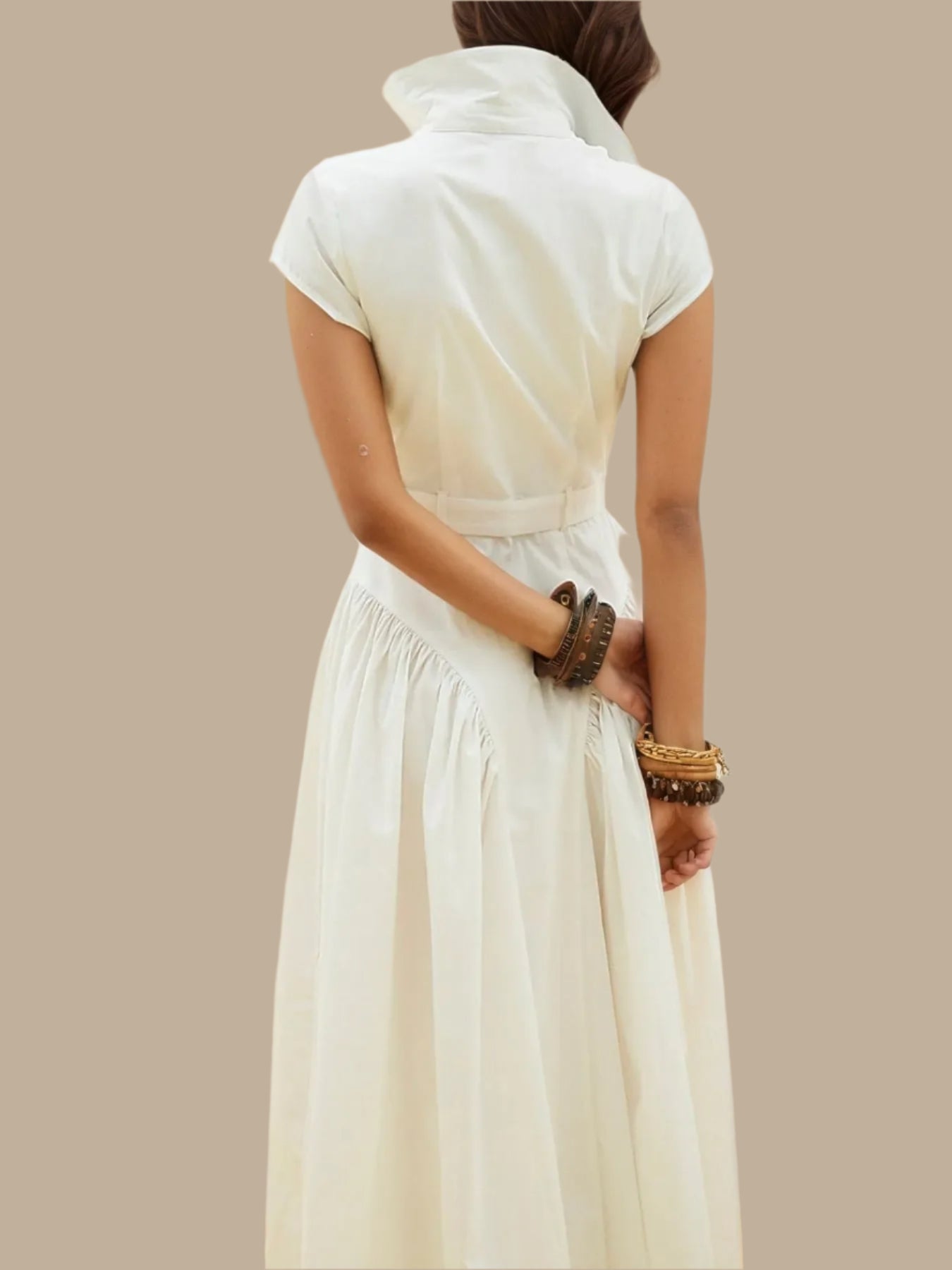 This elegant midi shirt dress features a crisp, white design with a button-down front and a flattering belted waist. The dress has cap sleeves and a sharp collar, offering a tailored look. Gold-toned buttons run the length of the dress, complementing the matching white belt. The skirt has subtle pleating details, which add a gentle flare and movement. It is partially lined for comfort and coverage, ensuring a polished finish.